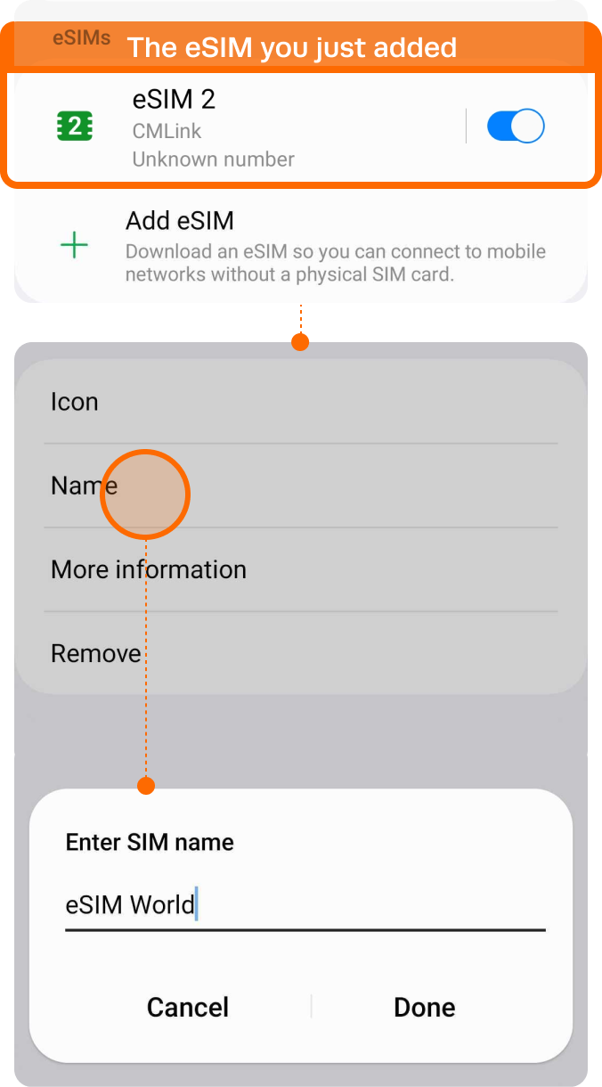 | ▸ | Choose the eSIM you just added Tap [Name] and Type on new label of your own, e.g. {Destination} – eSIM World. |